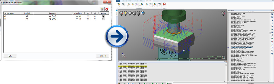 Tento modul aplikace NCSIMUL Machine umožňuje optimalizovat délky nástrojů, obrábění vzduchu a řezné podmínky Vašich NC programů (od 3os do 5os).
